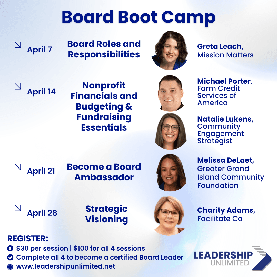 Join us for this nonprofit board training to become a certified Board Leader! (must complete all four trainings to become certified). Each training is $30, or sign up for all four for $100.